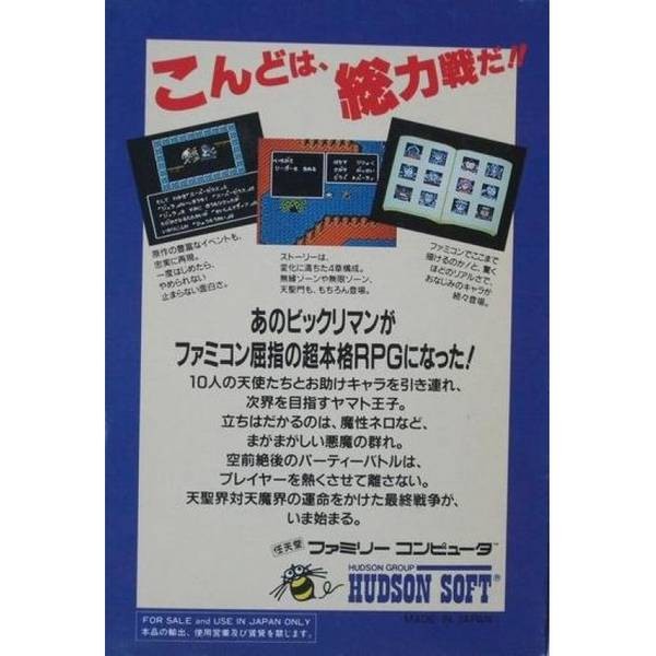 Bikkuriman World: Fierce Battle of the Holy Warriors was developed and published by Hudson Soft for the Nintendo Famicom (NES) on July 27, 1990. The game is based on the immensely popular 1980s Lotte “chocolate wafer sticker” franchise and its anime adaptation, Bikkuriman: Seima Taisen. At a time when collecting these stickers had become a nationwide craze in Japan, the game successfully transformed that phenomenon into a fully realized, system-driven role-playing experience. Unlike its predecessor on the PC Engine, which leaned more toward being a reskinned action game, this installment was built from the ground up as a traditional command-based RPG, establishing a proper adventure framework within the Bikkuriman universe.