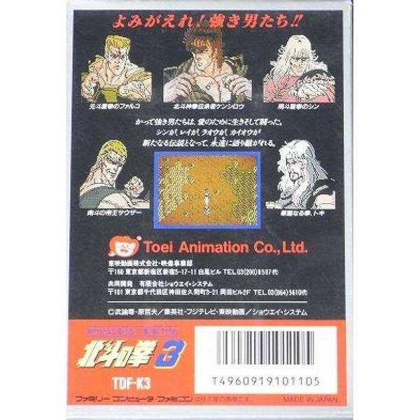 有別於前兩款北斗神拳 ,北斗神拳三代是推出的第一款RPG遊戲,北斗神拳3的評價雖然不高,但忠實的北斗迷卻不容錯過。遊戲中的內容 ,跟漫畫版的相當類似 ! 續作四代也是採用RPG模式,也是在紅白機平台的最後一款北斗系列遊戲。一開始拳四郎會在梅沙亞鎮出現,找到夥伴帕德及玲琳之後,就可移動到密諾里鎮。透過與民眾交談後,了解許多食物都被基特搶走,於是與基特的戰鬥就此展開,故事也正式拉開序幕。