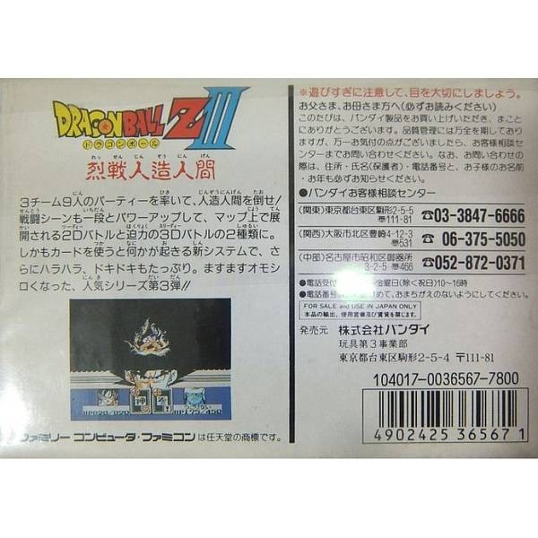 《七龍珠Z III:烈戰人造人》(Dragon Ball Z III: Ressen Jinzou Ningen / ドラゴンボールZ3 烈戦人造人間)於1992年8月7日由萬代(Bandai)在任天堂 Famicom(紅白機)上推出,是紅白機卡牌RPG系列的第三部正統續作。當時,電視動畫正處於熱血沸騰的「人造人篇」,不僅延續前作《激戰弗力札》的優良傳統,更在動畫演出流暢度與戰鬥節奏上進行大幅度的優化,試圖在8位元主機的生命末期呈現最震撼的龍珠戰鬥體驗。