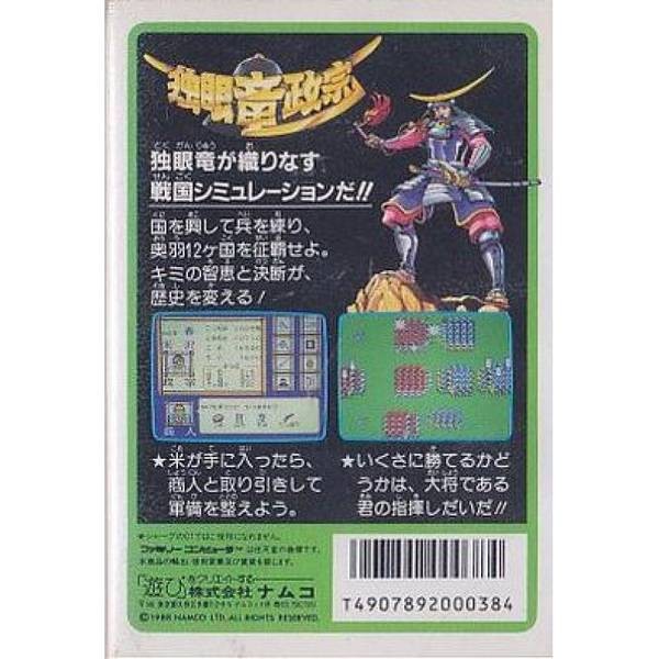 由Namco於1988年4月5日在任天堂Famicom(紅白機)上推出的《獨眼龍政宗》(Dokuganryuu Masamune),是一款以日本戰國名將 伊達政宗 為主角的歷史戰略模擬遊戲。誕生於NHK大河劇《獨眼龍政宗》播出後掀起的「政宗熱潮」之中,成功將當時社會對戰國英雄的關注轉化為互動式娛樂體驗。雖然本質上屬於偏硬派的SLG類型,但遊戲巧妙融合動作要素與戲劇化表現,使其在紅白機眾多歷史題材作品中脫穎而出。