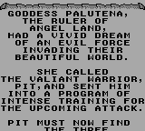 她立即召見自己的親衛隊長「皮特(Pit)」,這位尚年輕的天使戰士同時也是玩家所操控的主角。帕露提娜告訴皮特,天使之國的命運將交託給他,希望他在危機真正降臨前提前完成修行並獲得足以對抗惡魔的力量。唯有取得「三種聖寶(The Three Sacred Treasures)」並學會運用其力量,皮特才有能力與奧爾克斯軍團正面對抗。