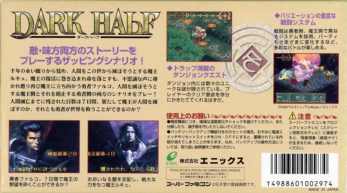 Today, Dark Half stands as one of the Super Famicom’s most unusual and daring RPGs—a gothic masterpiece that explores moral duality, free will, and sacrifice, wrapped in haunting music and a suffocatingly dark atmosphere. It’s often cited as a hidden gem of the 16-bit era, recommended to players who appreciate challenging, conceptually deep, and emotionally charged RPGs.
