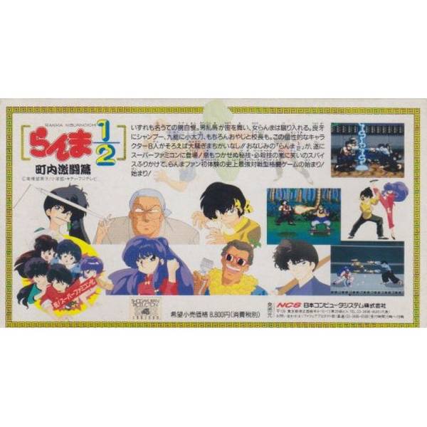 1992年3月27日於超級任天堂(SFC)推出的《亂馬 1/2 町內激鬥篇》(らんま1/2 町内激闘篇),是萬代(Bandai)以高橋留美子經典作品《亂馬 1/2》為藍本打造的首款16位元格鬥遊戲。在當時《快打旋風》帶動格鬥遊戲風潮逐漸升溫的背景下,並沒有走向硬派寫實的競技路線,而是選擇忠實呈現原作的幽默節奏與角色魅力,讓玩家在輕鬆愉快的氛圍中體驗對戰樂趣。正因如此,它不僅成功在SFC初期市場站穩腳步,也為後續多款《亂馬》改編格鬥作品奠定風格基礎。