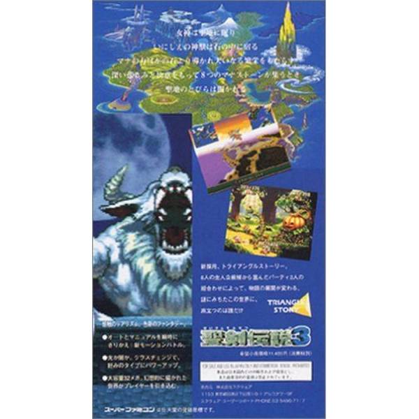 Trials of Mana (聖剣伝説3 / Seiken Densetsu 3) was released in 1995 by Square (now Square Enix) as the third installment in the series, launched for the Super Famicom in Japan only. Known for its complex branching storyline, innovative character progression system, and rich gameplay, it is widely regarded as one of the pinnacle entries in the franchise.