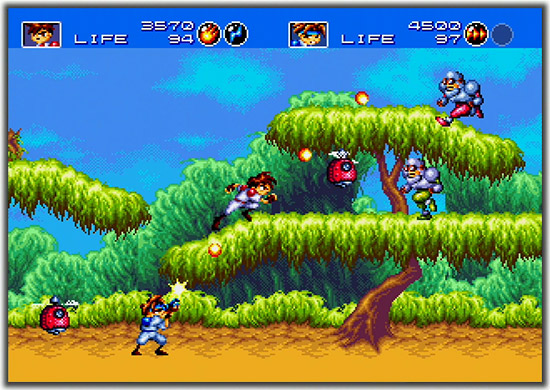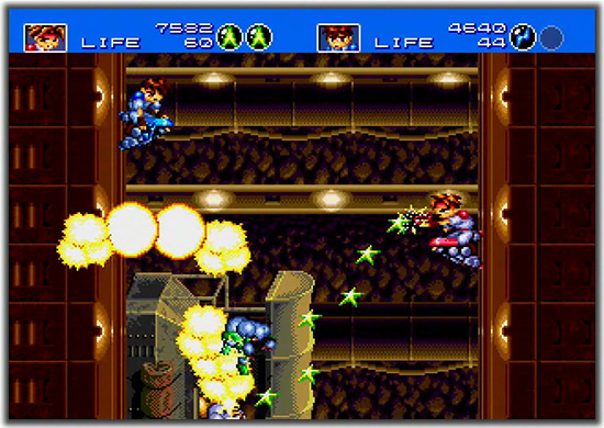 遊戲的簡易程度可以調整,一開始生命值是100,會顯示在畫面的左上方。武器的選項有四種,可選擇適合自己的攻擊方式,射擊有分自由式(Free Shot)及固定式(Fixed Shot)。在自由模式中,可以持續攻擊並移動。固定式則是可以用八種方位射擊,缺點是射擊時無法前進。沿路會補給生命及不同的武器,可以在冒險途中取得。雖然後期難度大增,但是可以透過無限次的接關持續挑戰。生命值採用數字計算,只要掌握頭目的弱點,破關並不會太困難。由專業的製作團隊TREASURE研發的暢銷動作射擊遊戲。2位可使用10種不同彈種的銀河快槍手,為了阻止帝國復活破壞神的計劃,周旋在被奪取的4個秘石之間奮勇作戰。
