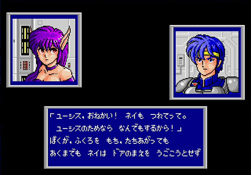 The game opens with the protagonist, Rolf (Japanese: ユーシス / Eusis), repeatedly dreaming of a mysterious girl—apparently Alis—locked in battle with a demon before he suddenly awakens. Rolf, age 20, is an investigator living in Paseo, the capital of Mota, together with his adoptive sister Nei. His parents died in a spaceship accident when he was ten, leaving him the sole survivor. Nei, despite her mature appearance, is a “newman”—a being created through the fusion of human and animal cells.