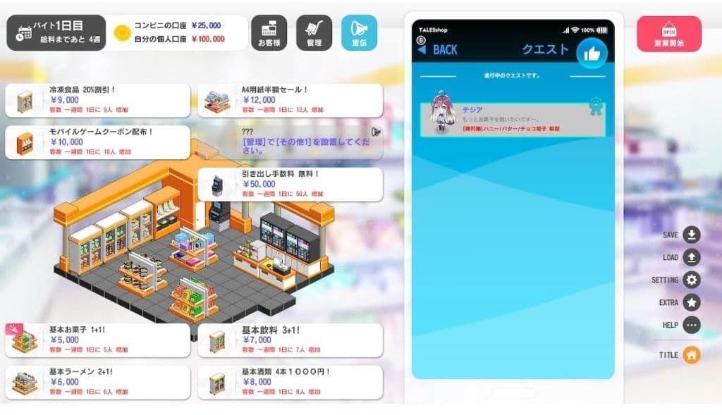 Players must use the suggestions provided by Some Some to increase the girls' affection. If the goal is not achieved within 302 days, a bad ending will occur. On regular days, players need to keep updating product statuses or meet customer demands. When management goals are achieved, income can be increased, allowing players to give gifts or engage in conversations to boost the girls' affection and achieve a good ending.