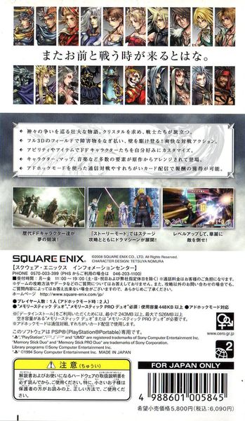"Final Fantasy Dissidia" is an action role-playing game released by Square Enix in 2008 for the PlayStation Portable (PSP). As a spin-off fighting game from the main series, it brings together iconic characters from multiple Final Fantasy games to battle against each other. The game blends fighting mechanics with RPG elements, allowing players to control unique characters in a variety of battles.