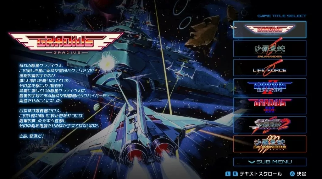 收錄多款經典橫向捲軸射擊遊戲,包括《Gradius》、《沙羅曼蛇》(Salamander)、《Life Force》、《Gradius II - GOFER的野望 -》、《Gradius III -從傳說到神話-》、《沙羅曼蛇2》,以及首次公開的全新作品《沙羅曼蛇III》。