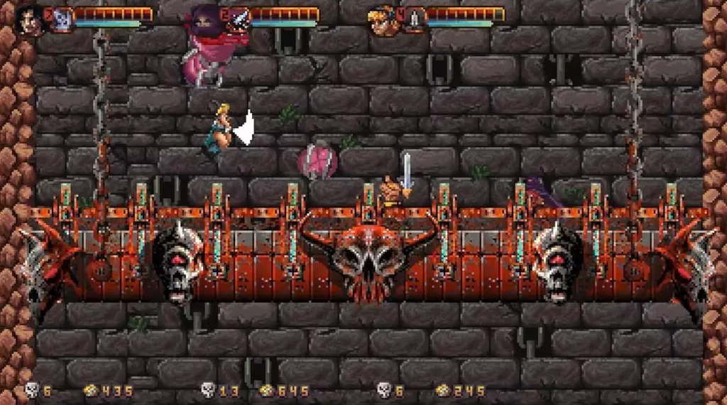 In terms of gameplay, Abathor remains faithful to the pacing and challenge of classic platformers. Players must use a combination of jumping, dashing, slashing, and special abilities to overcome traps and waves of enemies, while cooperating with teammates to defeat formidable foes. The game supports up to four players in local co-op but does not include online multiplayer. The controls retain a deliberate “retro” weight, with snappy attacks and movement requiring precision and timing in every encounter. The game features three difficulty modes—easy, normal, and bravery—and adds modern enhancements like sprinting, a rewind function, time attack challenges, and fine-tuned difficulty adjustments to improve overall fluidity and replayability.