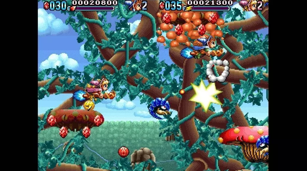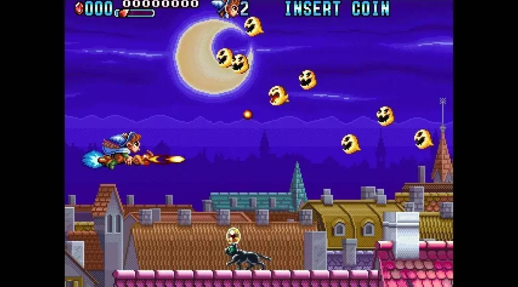 Mystic Riders shifts into a fantasy-inspired setting, allowing players to choose between two characters: the blue-robed wizard Mark and the red-cloaked witch Zeal. Mounted on broomsticks, they engage in aerial magic combat across whimsical and imaginative levels. The game supports local two-player co-op, adding a layer of interaction and rhythm-focused gameplay that sets it apart from traditional shooters.