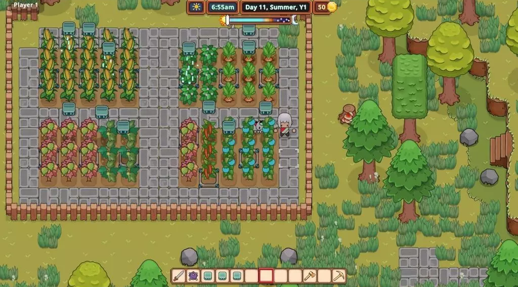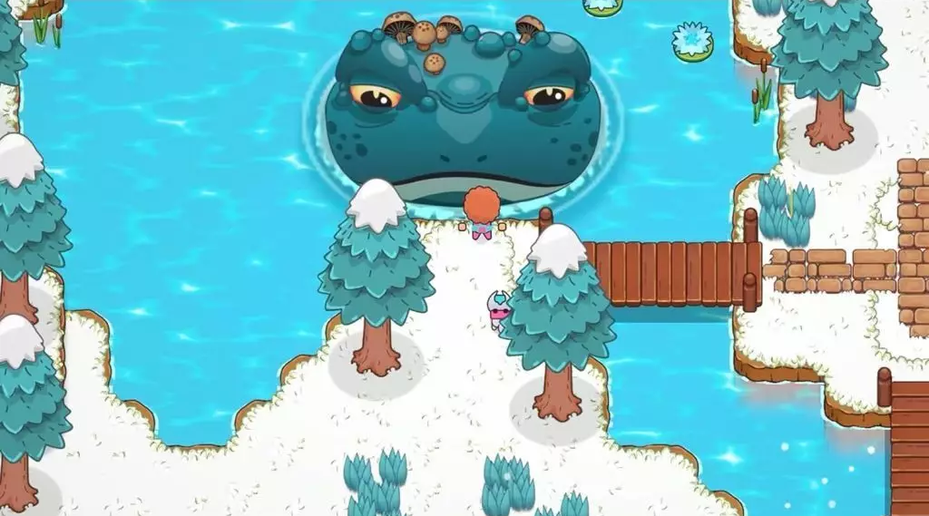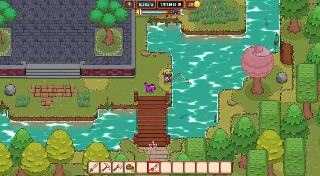 Gameplay combines top-down life simulation with adventure and combat. The farming system is highly flexible, allowing players to grow crops, fish, raise bees, and tend to animals without the typical stamina restrictions or tool durability found in games like Harvest Moon or Stardew Valley. This makes for a more laid-back experience. On the other hand, the dungeon-crawling aspect features real-time combat across four themed dungeons. Players enhance their skills and combat prowess by consuming collectible cards that grant various buffs, stats, and unique abilities to both the protagonist and their pet companion—adding a layer of strategy and customization.
