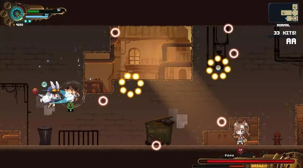地圖設計方面則偏向非線性探索,每個區域都有隱藏通道、解謎機關與能力限制區域,需透過獲得新能力(如二段跳、衝刺、穿牆術等)才能開啟新路線。這種探索式設計鼓勵玩家多次回訪場景,提升遊戲壽命與成就感。此外,也內建角色養成系統,可蒐集晶片模組來強化Tevi的技能與屬性,打造個人化戰鬥風格。