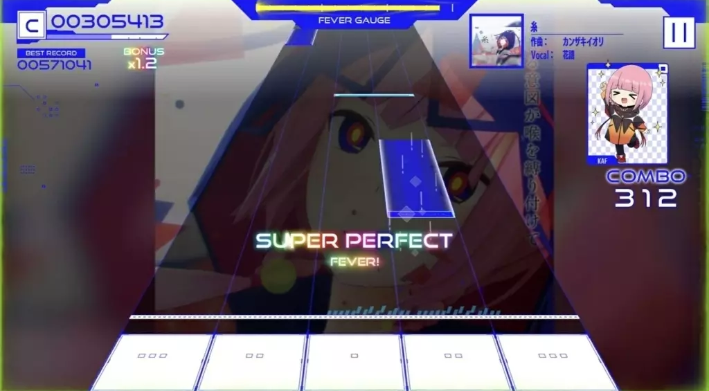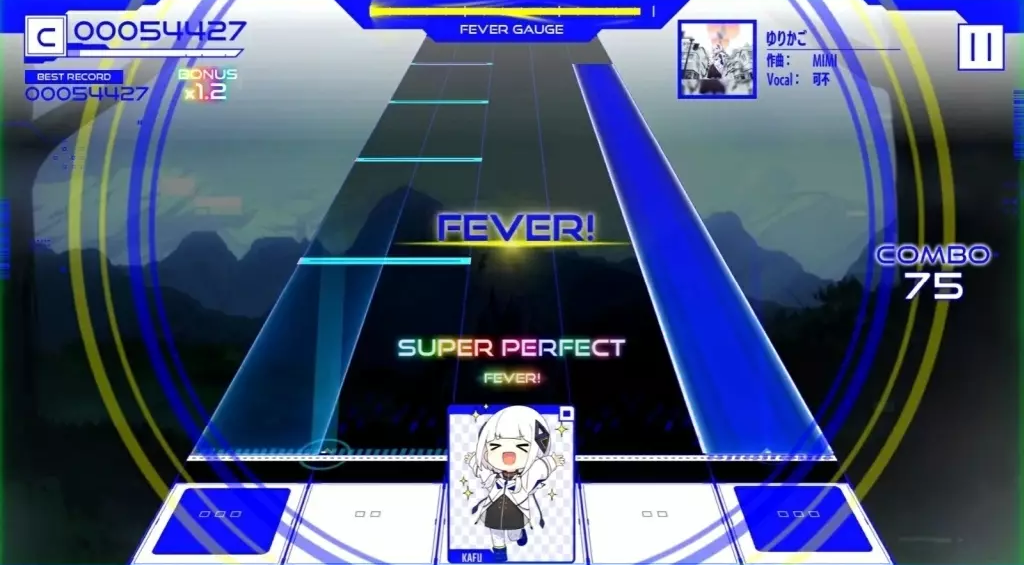 在遊戲玩法方面,採用多軌道節奏線設計,初期為四軌,隨著進程最多可達七軌。需根據音符節奏按下指定鍵位,並應對不同譜面的長音、連打與滑動等複合節奏操作,搭配動態背景MV與角色動畫,增添視覺與操作上的沉浸感。難度設有EASY至PRO四種級別,適合各類玩家挑戰。Steam與主機版本皆支援排行榜系統與倍速模式,提供競技與練習空間。