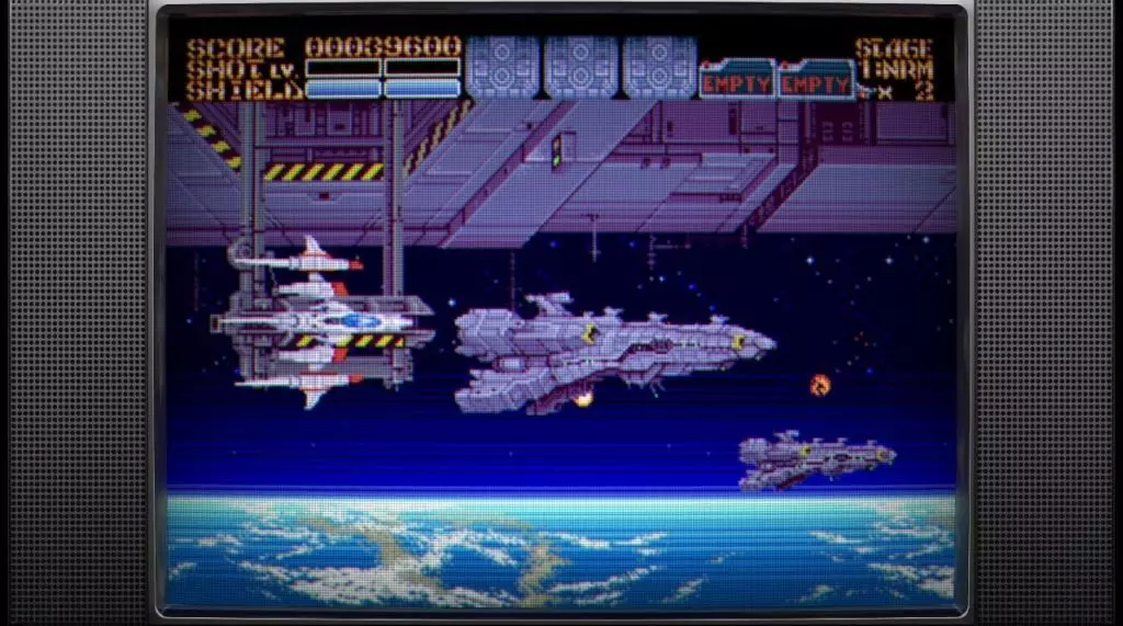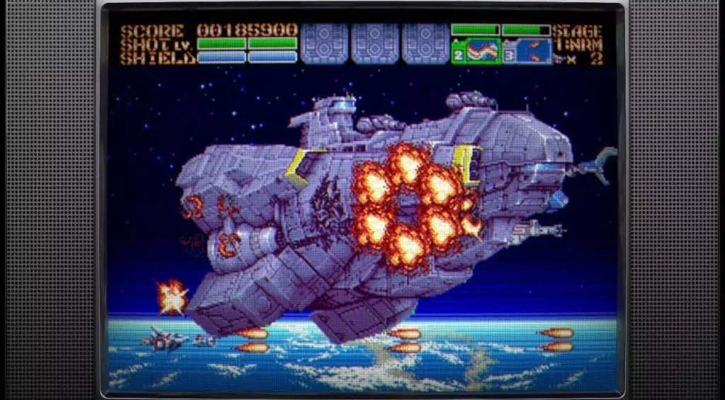 視覺方面,以16位元像素風格呈現,畫面充滿濃厚的90年代街機氣息。多層次背景設計與敵機爆炸特效充滿動態張力,巨大Boss登場時的戲劇演出令人印象深刻。場景從地表到宇宙,從科技都市到碎星戰場,每個舞台都如同一本視覺設定集在眼前展開。音樂方面則由知名遊戲作曲家古代祐三領軍創作,整體風格結合復古合成器音色與當代混音技術,無論是戰鬥高張力BGM還是關卡間過場的感性旋律,都大幅強化遊戲的情感渲染力。建議玩家使用耳機進行遊玩,以獲得最佳沉浸體驗。