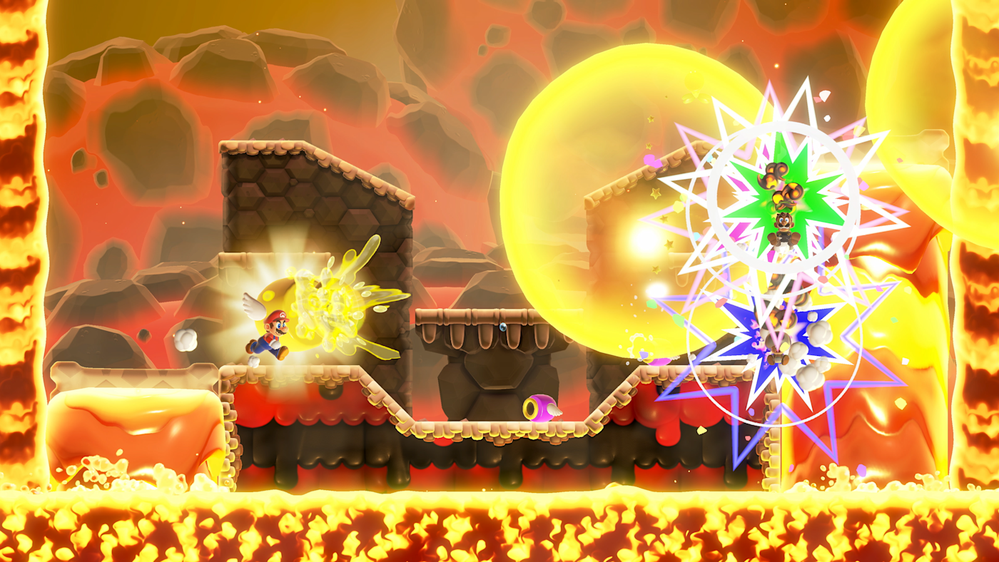 The game’s core mechanics retain the series’ signature smooth platforming, precise controls, and level exploration, allowing players to guide Mario and his companions through diverse environments while utilizing various items and abilities to overcome obstacles and enemies. Additionally, the interactive character "Chatty Flower" adds another layer of engagement by conversing with players, enhancing immersion and bringing a playful, life-like element to the game world.