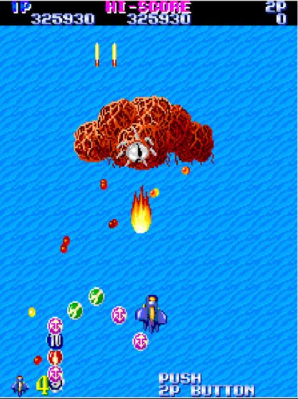 The controls are straightforward yet demand precision. Players navigate the aircraft, fire the main weapon continuously, and strategically deploy Gunballs when surrounded by hordes of enemies or facing powerful bosses. Timing and positioning are key, as the game’s difficulty escalates rapidly with waves of enemies and complex attack patterns. Every level concludes with a massive insect-like boss, requiring pattern recognition and careful resource management to defeat.