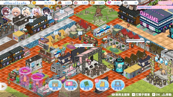 另一大特色是「偶像舞台」與「演唱會」系統。在城鎮中設置舞台,讓偶像舉辦表演,透過現場演出與巡演吸引更多粉絲,並獲得經驗值成長。每場演唱會皆為約30秒的迷你節奏遊戲,需在正確節奏下按下指令,成功達成目標分數即可解鎖新劇情與獎勵。當偶像等級提升後,還可分配技能點數、強化建築加成,甚至解鎖不同的舞台服裝。