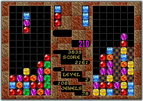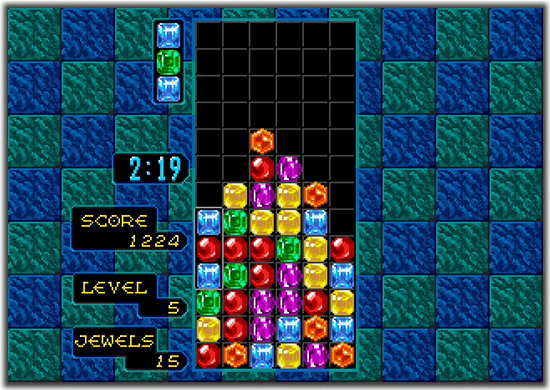 The game revolves around vertical stacks of three jewels that fall from the top of a narrow 6×12 playfield. While the jewels are descending, the player can shift them left or right and rotate the order of the three gems within the column. Once the column lands and locks into place, any horizontal, vertical, or diagonal line of three or more matching colors disappears. The jewels above then collapse downward under gravity, and if new matches form as a result, they trigger additional chains. This cascading effect—later known as “chain reactions”—became a foundational mechanic that influenced many puzzle games after it, including Puyo Puyo.