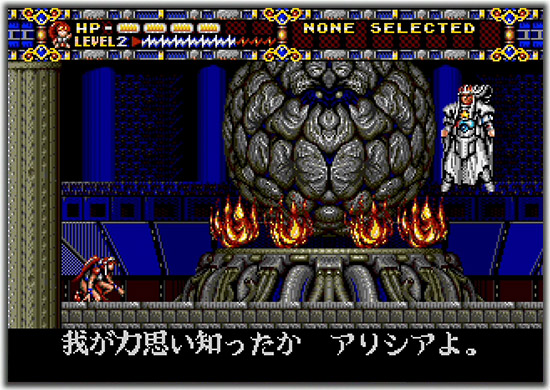 The game follows Alisia Deena Rain, a young sorceress who sets out on a journey to avenge her father and save the world from the return of the evil entity Baldour. When she was a child, Alisia witnessed her father’s torture and death at the hands of Baldour and his followers. Although Baldour had once been defeated and cast into space in a dormant cocoon, his subordinate Ornah manages to bring the cocoon back to Earth. Realizing that Baldour is close to awakening, Alisia uses her inherited magical powers to confront him and destroy him before he rises again. This simple yet dramatic premise is introduced with minimal exposition during gameplay, with most of the backstory originally described in the Japanese manual.