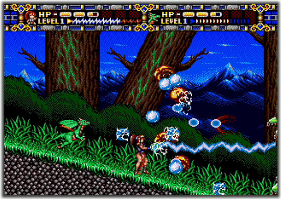 Supporting Alisia on her quest are four summonable beast companions, each with its own behavior and attack style. The Dragon Frye breathes fireballs, the Boomerang Lizard throws spinning projectiles, the Thunder Raven produces screen-wide electric blasts, and the Ball O’ Fire deals damage on contact. Only one companion can assist Alisia at a time, and the player can freely switch between them depending on the situation. These creatures not only attack enemies but also shield Alisia from incoming damage, creating a dynamic relationship between the heroine’s abilities and her familiars.