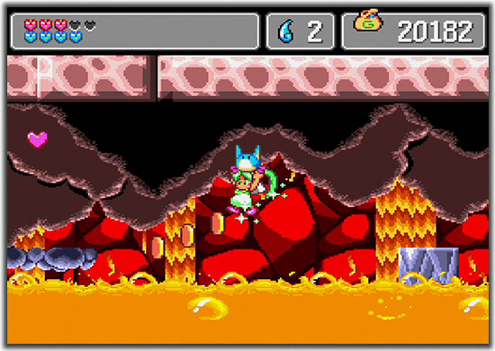 The gameplay blends side-scrolling action, platforming, and light RPG elements. Asha moves through towns, temples, caverns, and elemental shrines, each filled with enemies, traps, and puzzles. Unlike many RPGs of its era, the game does not use experience points or leveling systems. Instead, Asha grows stronger by acquiring better equipment and finding hidden items. Shops in the hub town sell swords that raise attack power, shields that improve defense and magical resistance, and armor (or bracelets in the remake) that increase her maximum health. Hidden throughout the world are “Life Drops,” and collecting ten of them permanently extends Asha’s life meter.