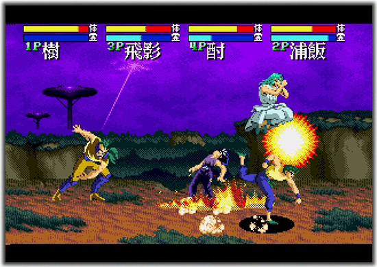 The combat system incorporates an impressive range of mechanics for its era. The game uses a two-line battlefield that players can switch between freely, though movement to unoccupied lines becomes slower to prevent easy escapes. Guarding relies on a dedicated guard button, eliminating directional guarding altogether—an unusual system that ensures players can withstand attacks from both sides even in chaotic four-way battles. Attacks from all directions become manageable, and blocking remains reliable thanks to a rule preventing chip damage from finishing a player, creating constant opportunities for comebacks.