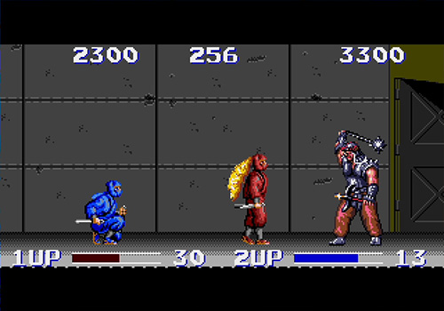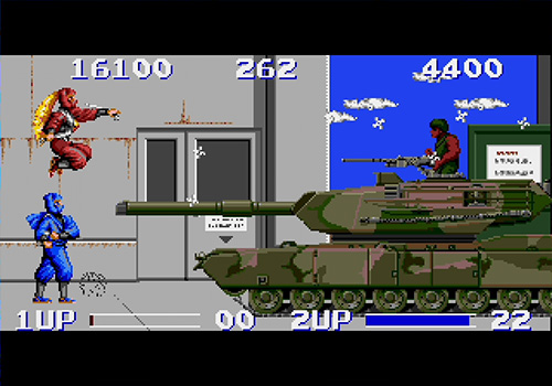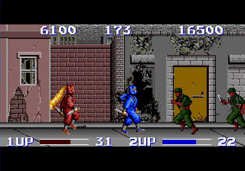 Gameplay remains faithful to the arcade: players survive constant multi-directional assaults in a single-plane side-scrolling format. Combat revolves around close-range strikes, throwing knives for long-range attacks, and multi-directional jumping. The kunai can unleash rapid melee combos, while the limited shuriken eliminate distant threats. The ninjas can cross-block projectiles with their arms, though fire and explosions cannot be defended against. The most crucial mechanic is the “spinning jump,” providing brief invincibility to escape encirclement or counter strong foes.