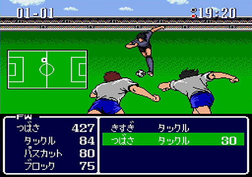 In terms of gameplay and controls, the title builds upon Tecmo’s command-based soccer system established since Captain Tsubasa II on the Famicom. Players move their characters on the field, and upon contact with opponents, enter a command menu to strategically choose actions such as dribbling, passing, tackling, or shooting. The Mega CD version introduced several refinements for smoother control and pacing. One key feature is the new “Technique Level” system, where each command improves through repeated use. This allows frequently used skills to become stronger while weaker skills can be developed through practice, giving players greater strategic depth in character growth. All character stats are fully visible, removing hidden experience values and making progression transparent.
