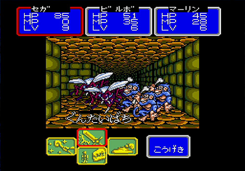 In terms of gameplay, it is a classic first-person dungeon-crawling RPG. The protagonist, Max (known as Hiro in English versions), explores a massive multilayered labyrinth with his childhood friends Milo (Bilbo) and Pyra (Merlin). The maze uses pseudo-3D rendering with exceptionally smooth movement and rotation—an impressive technical achievement for a 16-bit console. Its fluidity was often compared to Phantasy Star and Shin Megami Tensei, and was considered a major breakthrough for Sega’s approach to dungeon-crawler design. Monsters appear through random encounters, triggering turn-based battles in which turn order depends on agility and a random factor. Players may attack, cast offensive or support spells, use items, or attempt to flee. The game also features fixed boss battles and the four Trials of Strength, Wisdom, Courage, and Truth—key steps required to obtain the Light Weapons and ultimately face the evil sorcerer Mephisto, known as Dark Sol in English versions.