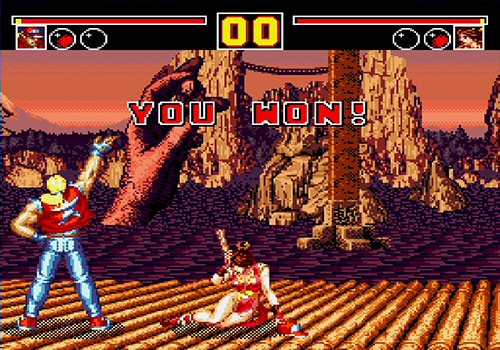 操控方面也比前作完善許多,Neo Geo的四按鈕設計被完整發揮成「弱拳、強拳、弱腳、強腳」,動作判定更明確、反應更靈活。每四場便會出現的加分挑戰關卡延續初代傳統,用擊碎石柱的方式讓玩家在激烈戰鬥中獲得喘息節奏。角色之間也不再是固定對戰排列,而是以全角色循環挑戰的方式進行,甚至可以碰上自己的分身,並附帶額外的對白與顏色設定,開啟後來 SNK 各作品慣用的「2P 顏色」傳統。