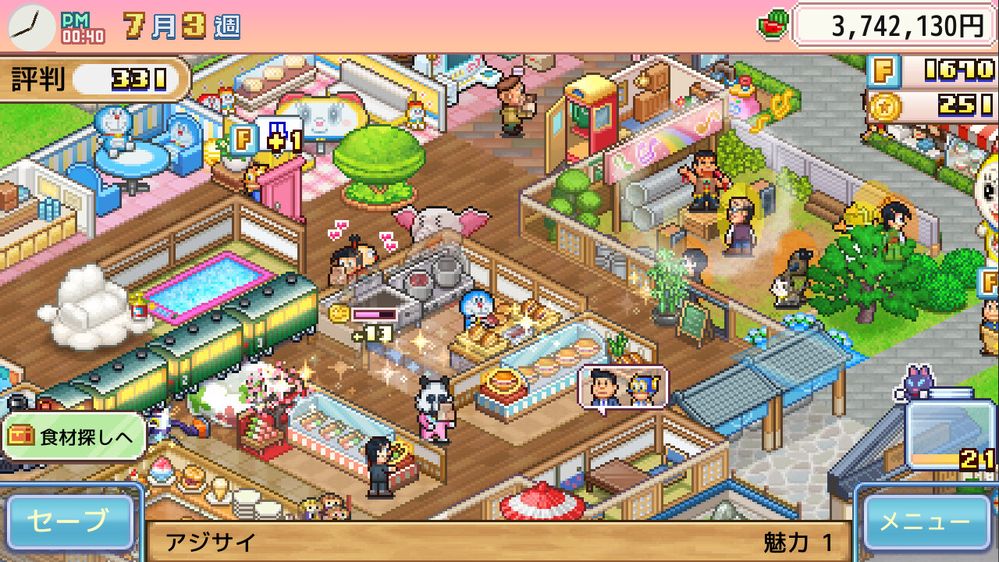 In terms of gameplay systems, the title follows Kairosoft’s classic management simulation framework. Shop operations revolve around dessert production, ingredient collection, facility construction, and staff training. Doraemon and five companions serve as employees, each possessing two key stats: “Exploration” and “Technique.” Exploration affects ingredient discovery, new character encounters, and recipe book upgrades, while Technique determines dessert production and research efficiency. Strategic staff assignment becomes crucial for efficient shop development.