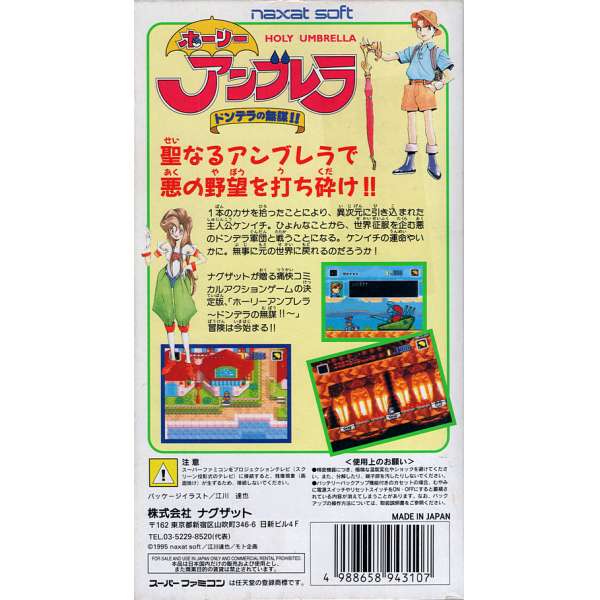 《光傘傳說》是Naxat Soft在1995年超任SFC平台發行的橫向卷軸移動遊戲。故事描述另一個空間的異世界正受到邪惡勢力的入侵,而英雄將充滿能量的傘傳送到地球,在一個下雨天,已經遲到的男主角拼命跑向學校,在途中撿起這把充滿能量的雨傘,瞬間被傳送到異世界,於是一場正邪對抗的冒險就此展開。