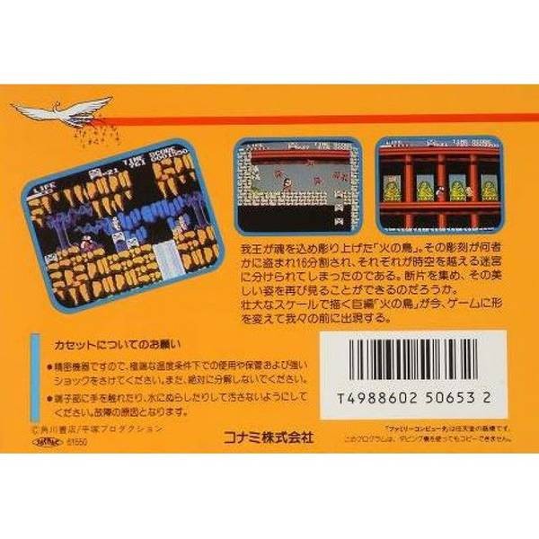 "Phoenix," a manga created by the Japanese animation master Osamu Tezuka, was adapted into an animated film in 1986. Kadokawa Shoten, the publishing house, commissioned Konami, known for producing action games, to develop and officially release this side-scrolling action game on January 4, 1987, on the Nintendo famicom platform. The manga consists of several arcs, including Dawn, Future, Space, Yamato, Phoenix, Resurrection, Nostalgia, and Feathers of Turbulence.