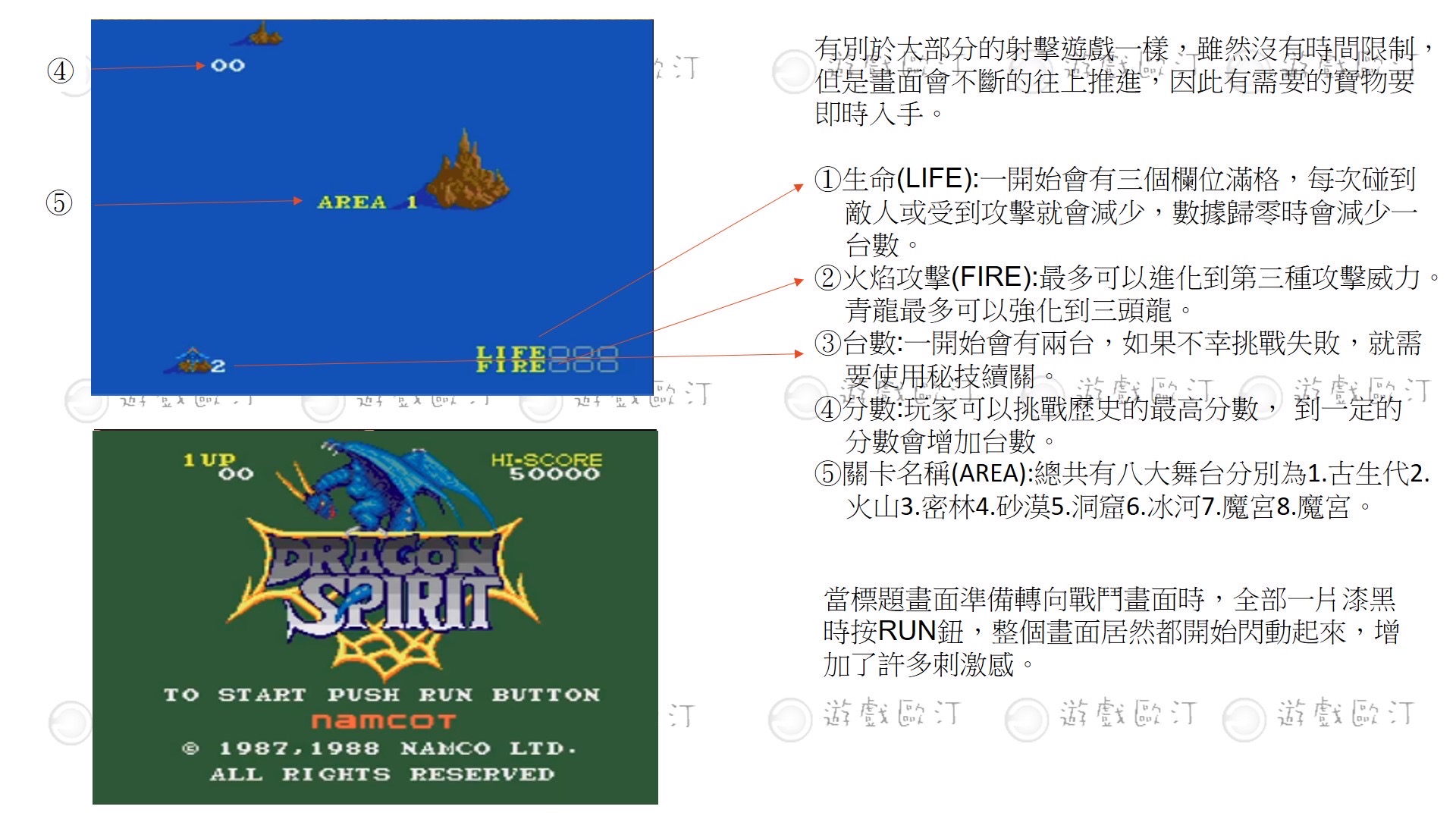 1987年,Namco推出街機遊戲《龍魂》(ドラゴンスピ/Dragon Spirit),同時授權Atari Games在美國進行製造和上市。遊戲的街機續作《龍魂2》於1990年問世,兩位玩家可以在同一畫面中遊玩。PC Engine(PCE)版本於1988年由Namco在日本發行,隨後在隔年由NEC在北美推出。PCE版本相當忠實地還原了街機版,差異主要體現在第五關的洞穴沒有水,原本的第七和第八關被完全刪除,而第九關被分成兩個部分。原先的小頭目九頭蛇被設定為第一個城堡階段的頭目。PCE版本可在Wii Virtual Console上購買。