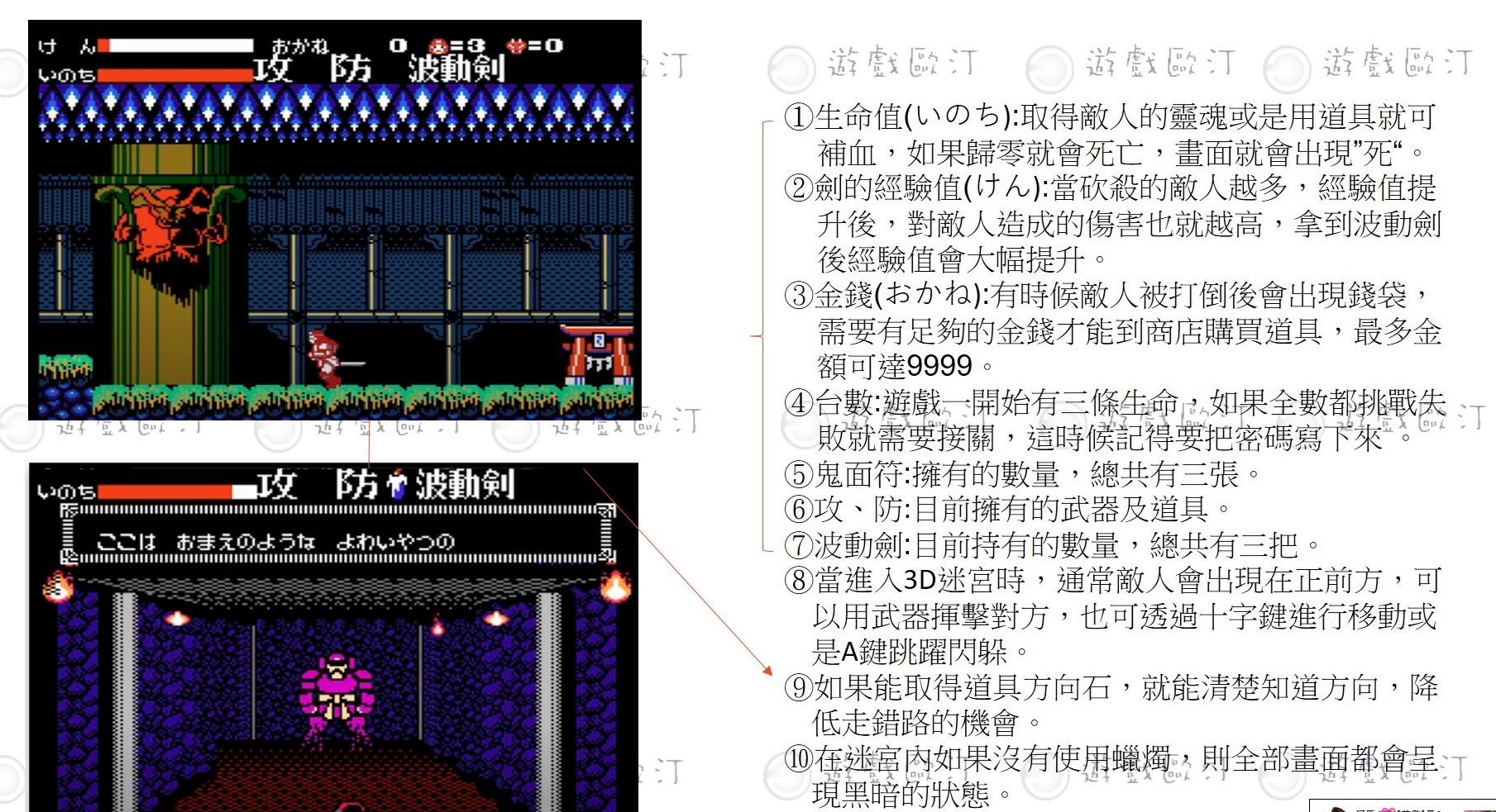 遊戲中的主要資訊顯示在畫面上方的兩個欄位,分別是「劍」和「生命」。可以通過打倒敵人來積累經驗值,提升劍的攻擊威力。然而,如果生命值歸零就會失去一條生命,但可以透過吸取敵人的靈魂或使用補血道具來增加生命值。遊戲並未提供存檔功能。當挑戰失敗時,將會得到一組由16個文字組成的「復活咒文」,下次重新開始遊戲時,可以輸入密碼來繼續挑戰,但金額將減半。