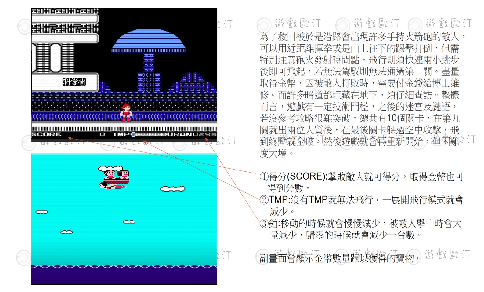 操作方式很簡單,透過十字鍵就能進行左右移動。A紐是跳躍,B紐是攻擊,按下跟B紐就可以聯繫博士。如果需要起飛就需要跑步後快速三小跳步後就可騰空,只是需要注意下方欄位的TMP欄位,到底的時候就會被迫降落。當在平地走的時候,TMP的箭頭會重新回到最左邊。右下方的顯示是鈾的數量,只要移動或是被敵人擊中都會減少,歸零的時候就失去一台數。